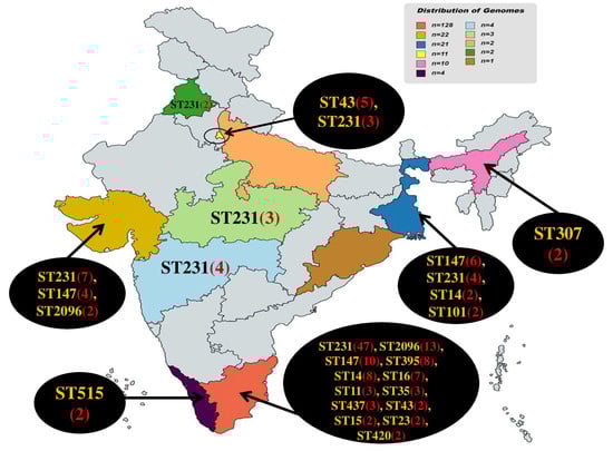 Geographic location of genome collection and state-wise ST distribution. ST found in at least 2 genomes are included in this figure. (n) Represents the number of genomes, and colors represent the states: carrot red (n = 128)—Tamil Nadu; mustard yellow (n = 22)—Gujarat; cyan (n = 21)—West Bengal; yellow (n = 11)—New Delhi; pink (n = 10)—Assam; purple (n = 4)—Kerala; sky blue (n = 4)—Maharashtra; pastel green (n = 3)—Madhya Pradesh; orange (n = 2)—Uttar Pradesh; green (n = 2)—Punjab; brown (n = 1)—Orrisa. Digits in red fonts in brackets denote the number of genomes having respective STs. MapChart online tool was used to generate this figure.