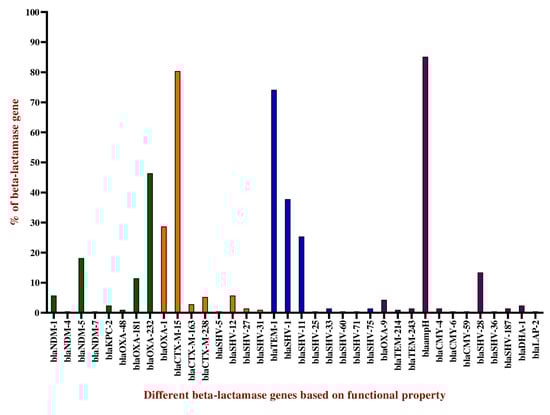 Percentage distribution of β-lactamase genes among strains. Bars in the graph indicate individual β-lactamase genes, in which bars in green indicate the carbapenemase gene, orange indicates ESBLs, blue indicates BSBLs, and purple indicates other β-lactamase genes. The GraphPad Prism 8.4.2 tool was used to create this graph.