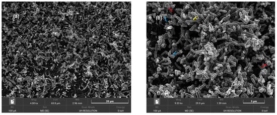 Representative scanning electron microscopy images showing the growth of polymicrobial biofilms in infected dentin samples: (a) ×4000; (b) ×13,000. Note the diversity of microbial composition (different colored arrows represent different species and bacterial shape types) grown within close proximity. Antagonistic and cooperative synergistic microbial interactions play an essential role in ecological regulation and endodontic biofilm formation.