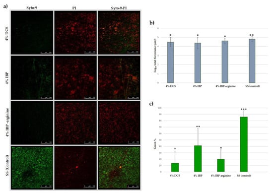 (a) Representative images of 3-week biofilms treated with diclofenac (DCS), ibuprofen (IBP), IBP-arginine and saline solution (SS) visualized under CLSM after staining with Syto-9/PI. Syto-9 stained nucleic acid and emitted green fluorescence (considered as live cells), whereas damaged cells were stained by PI (red fluorescence for dead bacteria); (b) the Log10 total biovolume in the groups was similar and showed a scarce but significant reduction with respect to the control. (c) Mean (SD) percentage of green (live) cells by group (n = 20 stacks/group). * The 4% DCS and 4% IBP-arginine groups gave the lowest viable cell percentages, without significant differences between them (p < 0.001). ** The 4% IBP group showed the highest percentage of viable cells, having statistically significant differences from the other groups. *** The control group showed statistically significant differences with all the experimental groups.