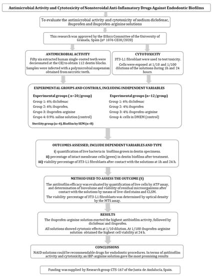 In conclusion, NSAIDs could be suitable drugs for the control of endodontic infection. In this work, ibuprofen mixed with arginine was the least cytotoxic and most effective antimicrobial solution against a polymicrobial root canal biofilm. Diclofenac sodium was more cytotoxic than both ibuprofen solutions and showed less antibiofilm efficacy than the IBP-arginine. The results obtained here should be confirmed in future investigations when the tested solutions might be recommended for clinical use.