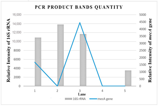Relative band intensity by densitometry analysis of electrophoresis (3% agarose) gel of the PCR products of the mecA gene and 16S rRNA performed using ImageJ quantification software. Lane 1 = Treated MRSA isolate (in a combination of 1000 µg/mL MEPL and 1000 µg/mL ceftriaxone); Lane 2 = Treated MRSA isolate (in a combination of 2000 µg/mL MEPL and 1000 µg/mL ceftriaxone); Lane 3 = untreated MRSA isolates, Lane 4 = blank, Lane 5 = MSSA isolate (control).