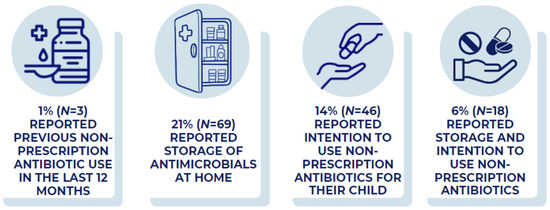 A total of 190 participants reported that their child had taken antibiotics in the previous 12 months, but only three participants reported that this antibiotic use had been outside the context of a healthcare prescribing situation (non-prescription use) (Figure 1). These three participants said that they had obtained antibiotics without a prescription from a local store or market—such as flea markets, yerberias (variety stores selling Central and South American products including medicines), and herbalists shops—in the U.S. In total, 69 caregivers reported having stored antimicrobials at home, excluding any child’s currently prescribed antibiotics courses, and 46 (14%) participants said that they would give non-prescription antibiotics to their child without contacting a healthcare professional. There were 18 (6%) caregivers who had stored antimicrobials at home and intended to use non-prescription antibiotics (Figure 1). The primary source for caregivers who reported having stored antimicrobials at home or intended to use them was left over from a previous prescription.