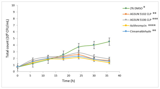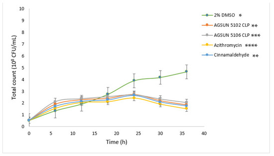 An exponential growth was seen in P. aeruginosa (Figure 1) and C. violaceum (Figure 2) treated with 2% DMSO throughout the incubation period, with a total bacterial count of 4.53 × 108 CFU/mL and 4.65 × 108 CFU/mL, respectively, after 36 h. However, while the lag phase (before 15 h for both organisms) of the oil- and reference standards-treated cells was comparable to the negative control (2% DMSO-treated cells), a moderate decrease in bacterial counts was observed for both organisms after 15 h, with the most profound effect observed with azithromycin (1.1 × 108 CFU/mL for both organisms) after 36 h. The total bacterial count observed for AGSUN 5102 CLP-treated cells was comparable to the cells treated with cinnamaldehyde, which were significantly different from cells treated with AGSUN 5106 CLP at p ≤ 0.05 for both organisms (Figure 1 and Figure 2).