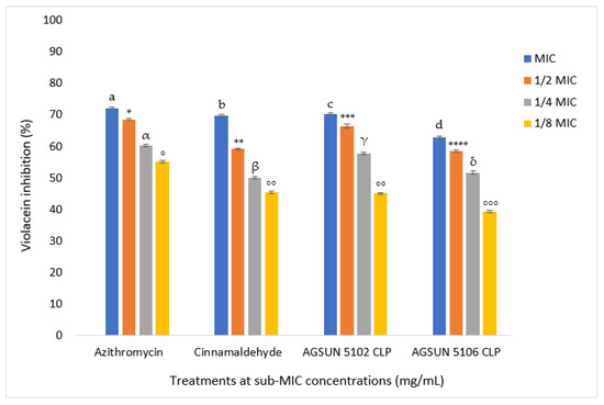 Inhibitory effect of the oils on the production of violacein by C. violaceum ATCC 12472 at sub-MIC concentrations (mg/mL) of azithromycin at 0.25–0.031 mg/mL (MIC to 1/8 MIC), cinnamaldehyde at 3.75–0.47 mg/mL (MIC to 1/8 MIC) and both oils (AGSUN 5102 CLP and AGSUN 5106 CLP) at 91.8–11.48 mg/mL (MIC to 1/8 MIC). Letters/symbols represent statistical differences at p-value ≤ 0.05.
