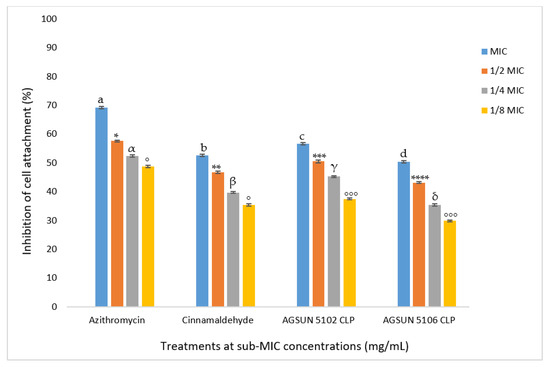 Inhibitory effect of the essential oils on cell attachment of P. aeruginosa ATCC 27853 at sub-MIC concentrations (mg/mL) of azithromycin at 0.25–0.031 mg/mL (MIC to 1/8 MIC), cinnamaldehyde at 3.75–0.47 mg/mL (MIC to 1/8 MIC), and both oils (AGSUN 5102 CLP and AGSUN 5106 CLP) at 91.8–11.48 mg/mL (MIC to 1/8 MIC). Letters/symbols represent statistical differences at p-value ≤ 0.05.