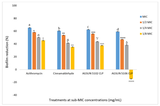 Inhibitory effect of the essential oils on biofilm formation of P. aeruginosa ATCC 27853 at sub-MIC concentrations (mg/mL) of azithromycin at 0.25–0.031 mg/mL (MIC to 1/8 MIC), cinnamaldehyde at 3.75–0.47 mg/mL (MIC to 1/8 MIC), and both oils (AGSUN 5102 CLP and AGSUN 5106 CLP) at 91.8–11.48 mg/mL (MIC to 1/8 MIC). Letters/symbols represent statistical differences at p-value ≤ 0.05.