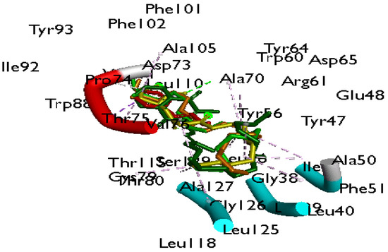 The MD simulation was carried out on the Center for High Performance and Computing’s system, using AMBER 18 software to run the FF18SD variation of the amber force field. The TIP3P water molecules, Na+, and Cl− counter ions were included to neutralize the system using the ANTECHAMBER atomic partial charges assigned to the ligands, and the non-bond interactions cut-off value was adjusted to 8 Å using the ANTECHAMBER atomic partial charges assigned to the ligands. The system started with 2000 minimization steps, was constrained with 500 kcal/mol potential for both solutes on another 1000 steps with the help of the steepest descent approach, and was then followed by conjugate gradients of 1000 steps. Then, using the conjugate gradient technique, the entire minimization stage was carried out in 1000 unrestricted steps. To maintain a constant volume of water and atoms, the following MDS stage involved 50 ps of heating from absolute zero (0 K) to 300 K. The solutes were then exposed to collision frequency and possible harmonic constraint (10 kcal/mol) (1.0 ps). The system was then brought to equilibrium by applying 500 ps while maintaining a constant heating temperature of 300 K. Other factors, such as several atoms and pressure (at 1 bar), were kept constant to simulate an isobaric–isothermal ensemble (NPT) [35]. While each MD simulation took 100 ns on average and contracting H+ by simulation using the SHAKE algorithm using the SPFP precision model, the step size was reduced for the bond 2 fs. NPT, constant pressure, and the simulations agreed [35]. Temperature (300 K), pressure coupling constant (2 ps), randomized seeding, and a Langevin thermostat number of collisions (1.0 ps) [35]. The CPPTRAJ program was used to process the trajectories for the analyses of the post-MD simulation parameters such as root–mean square deviation (RMSD), root–mean square fluctuation (RMSF), and radius of gyration (RoG), while the Leap Module Shake algorithm was used to reduce the expansion of chemical bonds involving hydrogen atoms. The molecular Mechanics/GB Surface Area technique (MM/GBSA) was utilized to compute the binding free energy for each ligand–protein combination over a period of 100 ns simulation [36]. Based on Ylilauri and Pentikäinen [37], the free binding energy (G) was calculated using the Molecular Mechanics/GB Surface Area Method (MM/ GBSA). This was performed to estimate the systems’ binding affinities. In a 100-ns trajectory, the average of G across 100,000 photos was found.