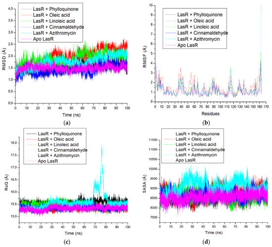 Pseudomonas aeruginosa has three main QS systems: LasI-LasR, RhlI-RhlR, and PQS-MvfR, all of which contribute to the formation of mature and differentiated biofilms [13,14,15]. However, the Las system regulates the expression of the other two systems with its autoinducer 3O-C12-HSL; thus, targeting the Las QS system could help prevent the expression of other QS systems [14,15,16]. In this regard, the molecular docking approach could help in the in silico screening of metabolites against the Las QS system due to its ability to identify lead metabolites from a library of compounds. Interestingly, the technique has been employed in the recent screening of metabolites against a bacterial QS system [17] and, thus, could serve as a less expensive approach to understanding compounds’ interactions with the QS system. However, due to the limitations of virtual screening relating to the lack of subsequent refinement (rescoring) and assessment of binding pose stability [18,19], further refinement and assessment of thermodynamic information are often encouraged using molecular mechanics/GB surface approach and molecular dynamics (MD) simulations [18,19], and in this study, these approaches were employed.