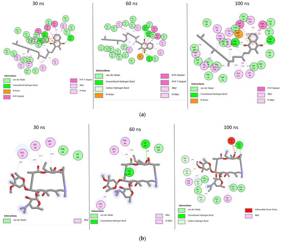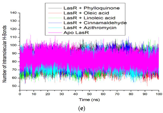 The top-ranked compounds and the reference standards exhibited different bond lengths and numbers of interactions in the active site of LasR and CviR, which were found to have an impact on the free energy of binding observed in this study. The highest number of interactions and hydrogen bonding contacts observed with the phylloquinone–LasR and the phylloquinone–CviR complexes after 100 ns is consistent with the binding free energy observed with the metabolites against the respective target. This observation indicated that a stronger and more stable ligand–protein complex results from more interactions and hydrogen bonding contacts, suggesting greater inhibition in the phylloquinone–LasR and phylloquinone–CviR complexes observed in this study. This conclusion agrees with the observation of Forli et al. [74], who showed that the higher the number of interactions, including hydrogen bonding, the higher the inhibitory effect of the inhibitor. Similar observations were noted with the other top-ranked metabolites compared to the reference standards against LasR and CviR, where top-ranked metabolites with higher binding free energy showed a higher number of interactions and hydrogen bonding contacts. In addition to the highest number of hydrogen bonding contacts, phylloquinone–LasR and phylloquinone–CviR complexes had the highest number of important interactions, such as the stacking interaction (stacked), which is one of the most powerful driving forces behind the biological complexation process, and protein folding. Taken together, all of these observations may have contributed to the observed higher affinity and improved stability between phylloquinone and the investigated targets. Since analyzing the number and type of interactions in just one simulation time frame could lead to a false positive conclusion, snapshots at the different time frames of the simulation were taken, and the observation that the consistent number of interactions and some conserved residues exist at 30 ns, 60 ns, and 100 ns during the simulation point to the potential enhanced inhibitory effect on the proteins by the top-ranked metabolites and reference standards during the 100 ns simulation period.