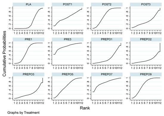 The ranking of the efficacy of the interventions was based on SUCRA, and protocol PREPO7 ranked the highest. The least effective protocol was POST1. No protocols were statistically significantly effective compared to the placebo. Supplementary Table S5 summarizes the RR and the SUCRA ranking of the treatment options.