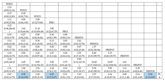 Eleven randomized control trials investigating nine interventions were analyzed to assess the efficacy of a preoperative antibiotic in preventing implant failure per implant. The network plot derived is shown in Figure 5. The network estimates that only protocol PRE1 (RR = 0.49 (95%CI: 0.26, 0.92)) is statistically significant in preventing implant failure.