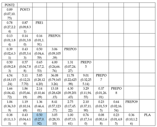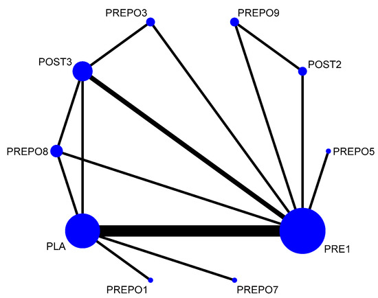 Network plot: implant failure (per patient). Abbreviations: PLA = placebo/no antibiotics; PRE1 = 2 g amox 1 h pre-op; PRE3 = 3 g amox 1 h pre-op; POST1 = 2 g amox immediately post-op; POST2 = post-op amox with clavulanic acid 625 mg 3 times daily for 5 days; POST3 = 500 mg q 8 h for 5 days post-op/postoperative amox 1 g twice a day for 1 week after surgery; PREPO1 = 2 g amox pre-op and 500 mg amox post-op for 3 days; PREPO2 = 2 g amox 1 h pre-op followed by 500 mg three times for 7 days; PREPO3 = 2 g amox 1 h pre-op, 500 mg q 8 h for 5 days; PREPO5 = 2 g amox pre-op and 1 g amox postoperative, and 1 g twice a day for 2 days later; PREPO7 = 1 g amox 1 h pre-op and 500 mg 4x daily for 2 days post-op; PREPO9 = 2 g amox 1 h pre-op, followed by postoperative 500 mg thrice for 5 days.