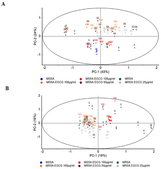 Another interesting observation from Figure 2A is that the distance between the scores of strains after EGCG exposure is higher with MRSA than with the MSSA strains. That is, the distances in the score plot of the MRSA strains with or without 100 mg/mL EGCG (green versus orange, Figure 2A) was higher than the distance between MSSA with or without 100 mg/mL EGCG (blue versus red, Figure 2A). This points to the fact that EGCG has a higher impact on the MRSA strains than on the MSSA strains. Furthermore, the incubation of the MRSA strains with EGCG apparently resulted in strains with a lower diversity of molecular composition in relation to the strains not exposed to EGCG, as the samples are less dispersed over the score plot (Figure 2A,B). Based on the spectra PCA, it was not possible to discover a pattern associated with the resistance reversion due to EGCG exposure.