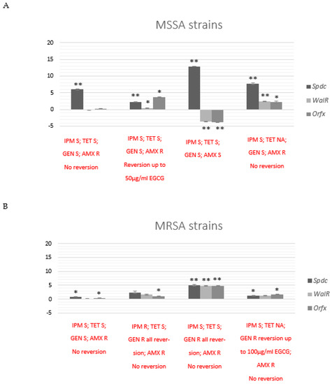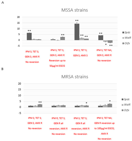 Graphic representation of qRT-PCR data analysis of selected MSSA (A) and MRSA (B) strains associated with EGCG exposure after 24 h of subculture. Data are representative of OrfX, SpdC and WalKR relative expression. 16S rRNA was used for normalization. Error bars represent the standard deviation between independent treatments and qRT-PCR replicates. Significant statistical values, which were compared with the most resistant strains and calculated with Student’s t-test, are illustrated as: * p < 0.01 and ** p < 0.001.