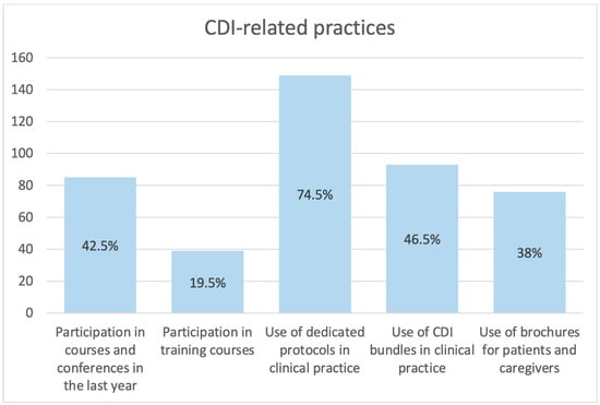 CDI-related practices. Histograms show the number of respondents who declared they had implemented the specific CDI-related practice on their daily professional activity. Percentages are reported in brackets.