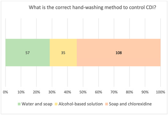 Knowledge of the proper hand washing method for CDI. The graph reports responses, in both percentages and numbers, to the question “What is the correct hand washing method to control CDI?”.