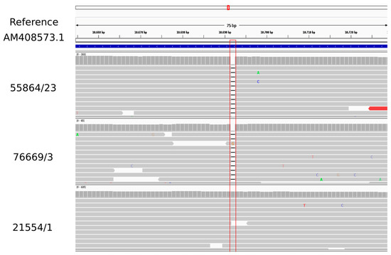 The variant calling analysis indicated that both linezolid-susceptible isolates, ID 55864/23 (CC1) and 76669/3 (CC398), presented a cfr gene with a single nucleotide deletion corresponding with position 10,692 bp in the Tn558 transposon of plasmid pSCFS6. S. warneri (AM408573) was used as a reference sequence. This single base-pair deletion caused a reading frameshift and, consequently, a truncated protein. The linezolid-resistant CC1 LA-MRSA isolate (ID 21554/1) harboured a cfr sequence identical to AM408573 from S. warneri (Figure 1).