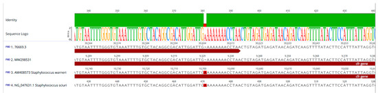 The presence of mutations of the cfr genes was confirmed, and their genetic environment was investigated by comparing the multiple alignment of the contig-harbouring cfr of isolate ID 76669/3 with publicly available selected sequences harbouring cfr from: (i) S. warneri (AM408573) [22]; (ii) S. sciuri (NG_047631) [51]; and (iii) S. aureus G322 (MW29853) [18]. This was achieved using Geneious Prime 2023.0.1 software.