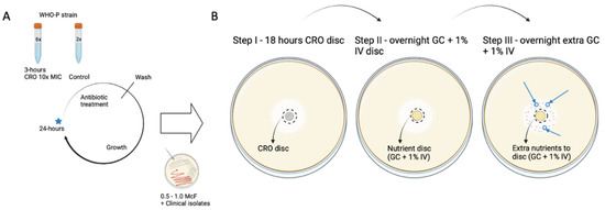 To detect the presence of tolerant phenotypes, the CRO-exposed population was analyzed using a modified T.D. test protocol (Figure 1; [19]). Briefly, the samples, after the CRO exposure cycle, were inoculated on BDTM Columbia Agar with 5% Sheep Blood and incubated at 36 °C overnight (18–24 h) in a 6.0% CO2 incubator. This was followed by a T.D. test wherein 0.008 µg of CRO antibiotic was added to a 6 mm Whatmann® antibiotic assay disc. After ~18 h of incubation, the CRO discs were replaced by nutrient discs, i.e., discs containing G.C. broth, and incubated overnight. Additionally, 10 µL of G.C. medium was added to the same nutrient disc and incubated for an additional night as N. gonorrhoeae-tolerant colonies emerged 48 h after adding the nutrient disc. The tolerant colonies were inoculated on fresh blood agar plates and stored in 30% glycerol skim milk at −80 °C.