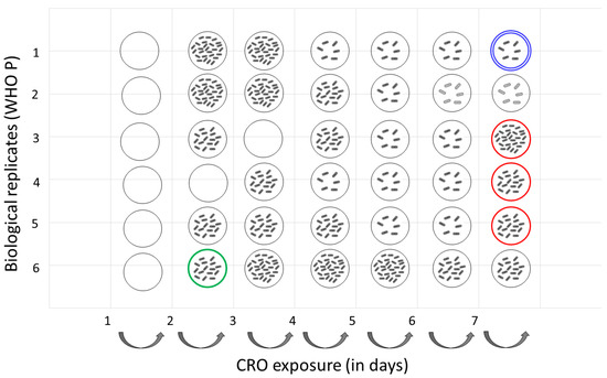 We recently induced tolerance to ceftriaxone (CRO) in N. gonorrhoeae reference isolates (WHO P) [17]. A highly susceptible CRO reference strain, WHO P with a CRO MIC of 0.004 µg/mL, was used [18]. Briefly, a direct colony suspension method was used, wherein WHO P reference colonies from overnight cultures were suspended in Gonococcal (GC) broth (containing 15 g/L bacto protease peptone, 1 g/L soluble starch, 4 g/L K2HPO4 (174.18 g/mol), 1 g/L KH2PO4 (136.08 g/mol), 5 g/L NaCl (58.44 g/mol), supplemented with 1% BD BBLTM IsoVitaleX,) adjusted to a turbidity of 0.5–1.0 McFarland (McF) and exposed to a high concentration (conc.) of CRO (10× the MIC (0.04 µg/mL)) for a fixed duration (3 h) in a cyclic manner. After each cycle, overnight cultures were suspended in (GC.) broth (50 µL in 5 mL), containing 0.04 µg/mL of final conc. of CRO antibiotic (Merck Life Science, Darmstadt, Germany). After this, antibiotics were removed by washing the cultures twice with 10 min centrifugation (1400× g) and resuspending the pellets (1 mL) in fresh GC. broth (5 mL) and incubated overnight (21 h) at 36 °C in a 6.0% CO2 incubator. The experiment was carried out in 15 mL falcon tubes placed on a roller-mixer (RM 5, CAT, Staufen, Germany). Following each exposure cycle, the CRO MIC was determined using a CRO gradient E-test ranging from 0.016 to 256 µg/mL (BioMérieux, France). The samples were stored at −80 °C in skim milk containing 30% glycerol. The cyclic CRO interval exposure experiment was carried out for six biological replicates for 7 consecutive days. Six and two populations were tested with and without the antibiotic, respectively.