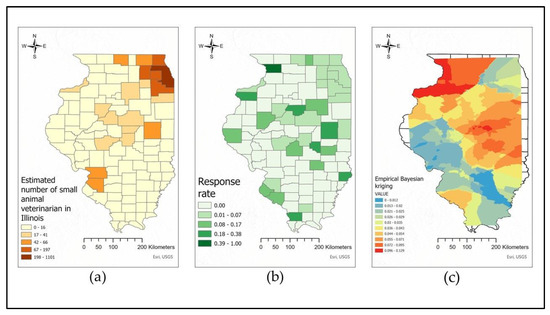 Choropleth map of the estimated number of small animal veterinarians in Illinois (a). Choropleth map of response rates of the survey on AMR and AMU practices among Illinois companion animal veterinarians (b). Isopleth map of the spatial interpolation of survey response rates by using empirical Bayesian kriging (c).