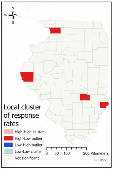 The Cluster and Outlier Analysis (Anselin local Moran’s I statistics) Tool detected five counties with high response rates that were surrounded by counties with low response rates (high-low outlier clusters) (Figure 3; Table S2).