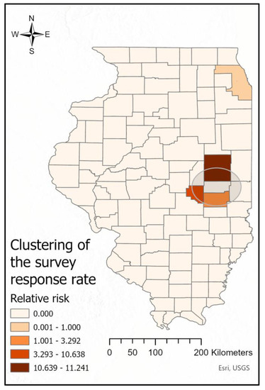 The purely spatial scan statistics using a discrete Poisson model, having the relative risk (RR) as the measure of effect, detected two significant (p-value < 0.001) local clusters, one with higher-than-expected (RR = 9.52) and one with lower-than-expected (RR = 0.18) response rates (Figure 4). Four counties were included in the higher-than-expected response rate cluster (Douglas, Coles, Moultrie, and Champaign). This cluster included 15 responses, while only 1.88 responses were expected. Cook County was identified as a lower-than-expected response rate spatial cluster with 9 responses, while 33.88 responses were expected (Figure 4). We also calculated and presented the RR for each county included in the significant spatial cluster that showed the highest RR for Champaign County and the lowest for Douglas County (Figure 4).