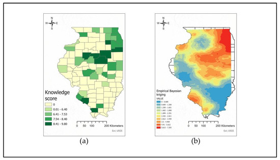 Of the 83 responses, 75 responses were included in the knowledge score calculation. The average knowledge score by county ranged from 0 to 9.8, which is illustrated in Figure 5a. Kankakee County showed the highest knowledge score (9.8 out of max. 11), followed by Woodford (9.4) and Union County (9.4). The empirical Bayesian kriging of the knowledge scores is presented in Figure 5b. The values ranged from 0 to 0.72 and displayed regions with high knowledge scores in the northeast, northwest, central, and southwest regions of Illinois.