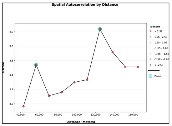 The Incremental Spatial Analysis (Global Moran’s I statistics) Tool results are shown in Figure 6. The first significant knowledge score peak was identified at 56.77 km, while the maximum knowledge score peak (highest Z-score) was identified at 124.53 km. Thus, the 124.53 km distance band and the “zone of indifference” conceptualization parameter were used for the local spatial cluster analysis.