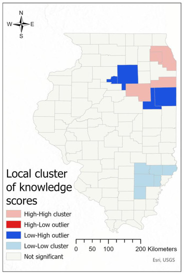 The Cluster and Outlier Analysis (Anselin local Moran’s I) Tool results of the knowledge scores are illustrated in Figure 7. Four counties were identified with high knowledge scores that were surrounded by counties with high knowledge scores (high-high cluster), four counties with low knowledge scores were surrounded by counties with high knowledge scores (low-high outlier cluster), and six counties were identified that had low knowledge scores and were surrounded by counties with low knowledge scores (low-low cluster) (Figure 7; Table S2).