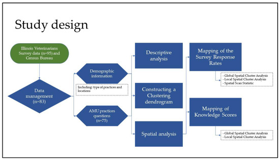 To the best of our knowledge, no previous study assessed issues related to antimicrobial stewardship in Illinois, and to address this knowledge gap, our study aims to assess Illinois small animal veterinarians’ knowledge and attitudes related to antimicrobial stewardship that impacts the selection of AMR and investigates whether these factors vary by location. In addition, we aim to identify areas where small animal veterinarians willingly participated in our study and regions where additional antimicrobial stewardship outreach programs are needed.