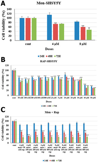 At 72 h, 4 µM and 8 µM mon were found to reduce SH-SY5Y cell viability to 74% and 47%, respectively (Figure 2A). In order to evaluate the effects of mon in combination with rap, the effects of rap alone on SH-SY5Y cell viability were also evaluated. Rap alone significantly reduced SH-SY5Y cell viability at 24, 48, and 72 h. Rap at 50 nM, 100 nM, 200 nM, 400 nM, and 800 nM at 72 h decreased cell viability to 59%, 62%, 58%, 63%, and 66%, respectively (p < 0.001) (Figure 2B). High efficacy of the combination of mon and rap was observed at 72 h. Combined applications of 4 µM mon with 50, 100, or 200 nM rap decreased SH-SY5Y cell viability to 26%, 27%, and 26%, respectively (p < 0.05) (Figure 2C).