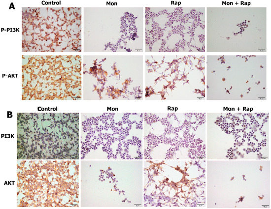 Cells were seeded on 8-well slides for immunohistochemical analysis. After 24 h, control, mon (4 µM), rap (50 nM), and mon + rap dose groups were formed and incubated for 72 h. The slides were washed with PBS and fixed with 4% paraformaldehyde. Then, they were treated with 3% H2O2/methanol for 10 min, washed with PBS, and blocked with blocking serum (Thermo Scientific, Waltham, MA, USA). They were next treated with primary antibodies at +4 °C for one night and washed with PBS. Following this, a specific secondary antibody was applied to the primary antibody. After washing with PBS, the secondary antibody was labeled with the streptavidin peroxidase enzyme complex. Proteins gained visibility with the DAB chromogen. The primary antibodies used and their dilutions were as follows: PI3K (1:2000, cat. no. BT-PHS00765, BTLab, Birmingham, UK), p-PI3K (1:2000, cat. no. BT-PHS00765, BTLab), AKT (1:2000, cat. no. BT-AP00334, BTLab), and p-AKT (1:2000, cat. no. BT-PHS00006, BTLab). In order to make the nuclei visible, they were counterstained with hematoxylin, washed in tap water until the dye ran, and covered with entellan after passing through increasing series of alcohol [36]. From each group, five different fields were photographed randomly at 200× magnification with light microscopy, and all SH-SY5Y cells showing AKT/p-AKT and PI3K/p-PI3K positivity were counted.