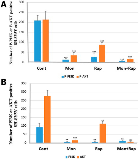 The mean number of PI3K-positive SH-SY5Y cells was 92.4±23 in the control group, while it was 4.8 ± 3 (p = 0.006) in the mon group, 5 ± 2 (p = 0.006) in the rap group, and 12 ± 4 (p = 0.008) in the mon + rap group (Figure 4B). Meanwhile, the number of AKT-positive SH-SY5Y cells was 275.6 ± 35 in the control group and 15.6 ± 7 (p = 0.000), 112 ± 15 (p = 0.001), and 6.6 ± 1 (p = 0.000) in the mon, rap, and mon + rap groups, respectively (Figure 4B).