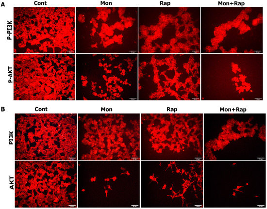 Evaluation of the effects of single and combined doses of mon and rap on the PI3K/AKT pathway using the immunofluorescence method. (A) Expressions of p-PI3K and p-AKT in different groups are labeled at the red fluorescent wavelength. (B) PI3K and AKT expressions in different groups are labeled at the red fluorescent wavelength. Bar: 50 µm.