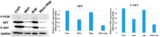 Single and combined administrations of mon and rap resulted in decreased expression of the PI3K/AKT pathway. pPI3K and AKT/pAKT protein expression was decreased in mon, rap, and combination groups compared to the control group. In addition, densitometric analyses showed that AKT and p-AKT expression decreased in all groups compared to the control group (Figure 6).