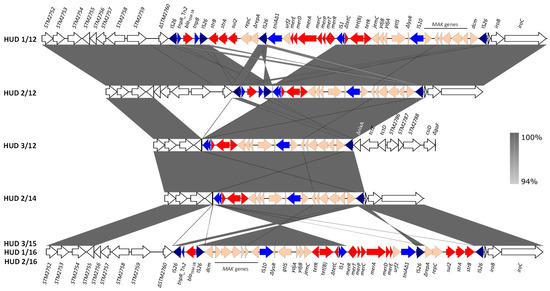 In contrast to the conservation of SGI-4, the RR regions displayed a high variability with four distinct structures shown by the seven isolates (Figure 3). In all cases, the RR element consisted of a contiguous module, as originally reported for monophasic S. Typhimurium strain 00-2006 [18]. However, multiple differences were observed, affecting the RR itself and the insertion site into the bacterial chromosome (Figure 3). Specific variations involved: (i) the genes responsible for the tetra-resistance phenotype, with blaTEM-1B, strA-strB, sul2 and tet(B), blaTEM-1B and tet(B), and only tet(B) in four, one and two isolates, respectively (see also Table 1); (ii) the mer locus, absent in three isolates; (iii) the number of IS26 copies, with four, three and one, in four, one and two isolates, respectively; (iv) the orientation of the RR region, most of which was inverted in three isolates sharing the same structure (HUD 3/15, HUD 1/16 and HUD 2/16). In agreement with the monophasic phenotype, the presence of RR was associated with large chromosomal deletions, always removing the fljA, fljB, and hin genes, whose products are responsible for the expression of the second phase flagellin and phase variation [44]. In five isolates, the RR element occupied the same position within the bacterial chromosome, between ΔSTM2760 and Δhp-iroB-iroC, accounting for a deletion of ca. 15 kb. In the remaining isolates, larger deletions occurred, encompassing from ΔSTM2758 to Δhp-iroB-iroC (22 kb; HUD 2/14) or from ΔSTM2758 up to ΔnixA (STM2783; 37 kb; HUD 3/12) (Figure 3).