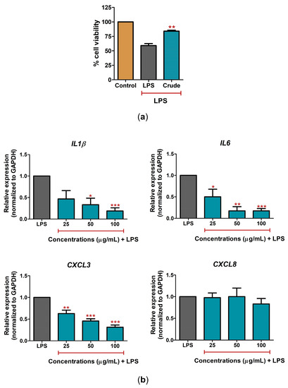 The effect of C. nutans extract on rescue from LPS-induced cell death and inflammation in CPEA cells. (a) The cell viability after treatment with LPS (10 ng/mL) in the presence or absence of C. nutans extract (100 µg/mL) at 24 h. (b) The changes in gene expression of IL1β, IL6, CXCL3, and CXCL8 after LPS treatment (10 ng/mL) with or without C. nutans extract (25, 50, and 100 µg/mL) at 24 h as determined by real-time PCR. The gene expression levels were evaluated and normalized with GAPDH (housekeeping genes) and compared with LPS without the C. nutans extract (set as 1.0). (Statistical analysis: * p < 0.05, ** p < 0.01, and *** p < 0.001.)