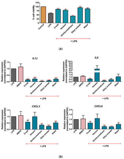 The effect of C. nutans extract fractions on rescue from LPS-induced cell death and inflammation in CPEA cells. (a) The cell viability after treatment with LPS (10 ng/mL) in the presence or absence of C. nutans extract fractions (100 μg/mL) at 24 h. (b) The changes in gene expression of IL1β, IL6, CXCL3, and CXCL8 after LPS treatment with or without C. nutans extract fractions at 24 h as determined by real-time PCR. The gene expression levels were evaluated and normalized with GAPDH (housekeeping genes) and compared with LPS without the C. nutans extract fractions (set as 1.0). (Statistical analysis: * p < 0.05, ** p < 0.01, and *** p < 0.001.)