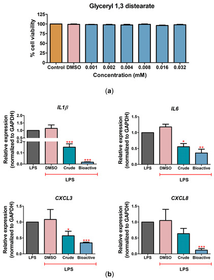 The effects of glyceryl 1,3-distearate (bioactive compound) in CPAE cells. (a) The cell viability after treatment with glyceryl 1,3-distearate (0.001–0.032 mM, two-fold dilution) at 24 h. (b) The changes in gene expression of IL1β, IL6, CXCL3, and CXCL8 after treatment with LPS combined with C. nutans extract or glyceryl 1,3-distearate at 24 h as determined by real-time PCR. The gene expression levels were evaluated and normalized with GAPDH (housekeeping genes) and compared with LPS without the C. nutans extract (set as 1.0). (Statistical analysis: * p < 0.05, ** p < 0.01, and *** p < 0.001.)