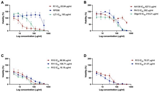 Figure 1. Viability of Balb/c 3T3 cells after incubation with antimicrobial peptides. (A) peptides R1, RP556, LZ1, (B) peptides AA139, PA13, Oligo10, (C) peptides R10, R11, R12, (D) peptides R13, R14. Viability expressed as %, compared to control, where applicable IC50 values are shown, n = 5.