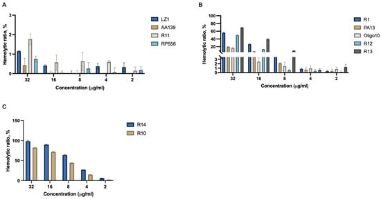 Hemolysis assay was performed using fresh human blood to evaluate the potential of antimicrobial peptides to induce red blood cell lysis. Peptides LZ1, AA139, R11, and RP556 did not induce hemolysis (Figure 3A); within the concentration range, the 2–32 μg/mL hemolysis ratio (HR) was below 2%, which is considered to be an acceptable level for clinical applications [53]. For R11, additionally, 128 and 64 μg/mL were tested, and only mild hemolytic activity was detected; HRs were in the range of 2.85–7.03%. Peptides R1 and R13 exhibited strong hemolytic activity at concentration range 8–32 μg/mL, PA13 and R12 were hemolytic at 32 and 16 μg/mL, and Oligo10 induced hemolysis at 32 μg/mL and showed mild hemolytic activity at 16 μg/mL (Figure 2B). Peptides R14 and R10 demonstrated strong hemolytic activity (Figure 2C). R14 was hemolytic at all tested concentrations (HR > 5%), and R10 at 2 μg/mL had minor hemolytic activity (2.26%). Additionally, for R10, 0.5 and 1 μg/mL concentrations were tested and no hemolysis was detected (HR 0.2–0.4%).