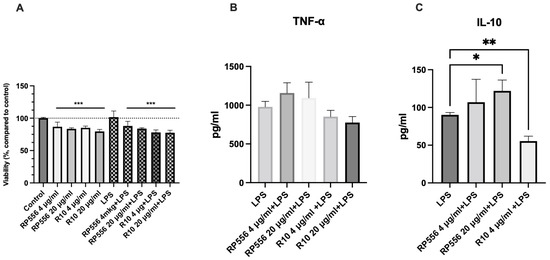 Given the different levels of cytotoxicity and hemolytic activity exhibited by both peptides, viability of PBMNCs after 24h incubation was assessed (Figure 4A) prior to measurement of cytokine levels. Both peptides slightly reduced viability of cells, however changes did not exceed 17.5% for RP556 and 22.4% for R10. In the case of R10, higher concentration had a more pronounced effect and combination with LPS and further reduced viability. RP556 induced secretion of TNF-α in lipopolysaccharide (LPS) stimulated PBMNCs, but in the presence of R10, TNF-α secretion decreased (Figure 4B). RP556 statistically and significantly increased secretion of anti-inflammatory cytokine IL-10. A 35.56% increase was detected in cell cultures incubated with LPS and 20 μg/mL RP55 compared to LPS alone (Figure 4C). This exceeds the change in TNF-α secretion, where RP556 produced increase below 18.3%. When 20 μg/mL R10 in combination with LPS was used, no IL-10 secretion was detected, while 4 μg/mL R10 significantly reduced IL-10 secretion. Contrary to the RP556, the effect induced by R10 was unexpected and could be considered as undesirable.