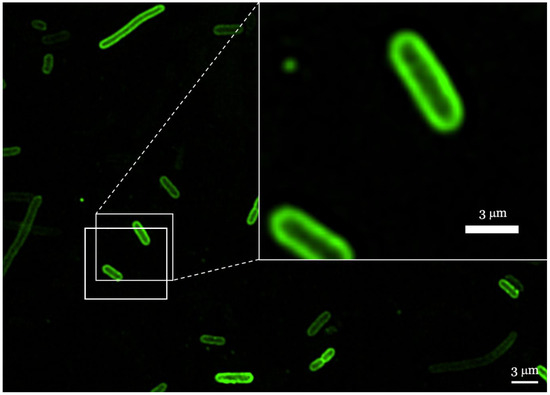 To investigate the localization of AMPs in membranes, peptides RP556 and R10 were labeled with Fluorescein-5-isothiocyanate (FITC, λex = 495 nm, λem = 519 nm). E. coli cells were incubated with FITC-labeled peptides in concentrations reaching half of their MIC values, and were observed via confocal microscopy. As shown in Figure 5, FITC-labeled RP556 peptide molecules were located at the cell membrane, indicating that this peptide can penetrate the cell membrane of E. coli. Likewise, R10 peptide behaved similarly, and the obtained sample images resembled the images shown in Figure 5.