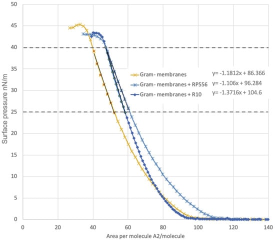 Figure 6. Localization of π–A isotherms for Gram-membrane model mixtures with peptides RP556 and R10.