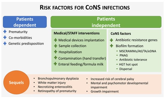 Preterm infants are more likely to develop a generalized life-threatening infection due to their theoretically immunocompromised condition, in which several components of the immune system are not fully developed at birth [63]. However, the high frequency of LOS caused by CoNS in preterm infants is also related to the fact that they are more likely to require prolonged use of central catheters, parenteral nutrition and mechanical ventilation, which are increased risk factors for CoNS infection [14,25,93,94] (Figure 1). In that sense, it was found that the analyses of bodily fluids such as blood, which are often necessary for diagnosis and implicate the use of invasive procedures, can increase the risk for CoNS-related LOS independently [95]. Recently, it was demonstrated that umbilical catheters are another vector for skin microflora transmission of CoNS into the bloodstream, via biofilm formation [96].