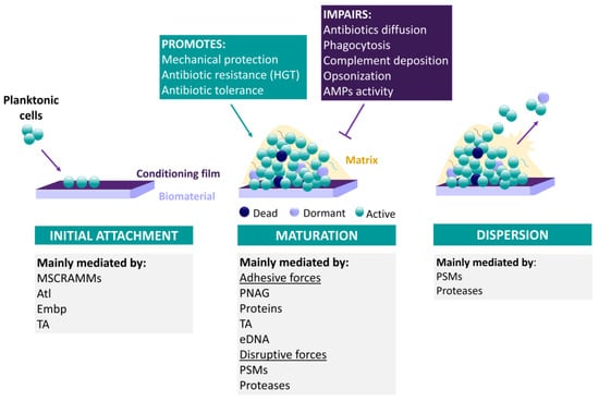 Biofilms are defined as complex communities of bacteria surrounded by a protective matrix, attached or not to a surface [128]. Biofilms are formed following three main stages; (i) initial attachment, (ii) maturation and (iii) dispersal [129] (Figure 2). As can be expected, the first stage is only important in the case of biofilms attached to a surface, such as medical devices, which is the focus of this review. Although CoNS can be attached directly to the medical device surface, in vivo, medical devices are readily coated by host proteins. As such, CoNS normally form biofilms through direct interaction with host matrix proteins [130]. This process is mostly mediated by MSCRAMMs, i.e., microbial surface components recognizing adhesive matrix molecules [131,132], such as serine-aspartate repeat protein G (SdrG) and F (SdrF) [133]. In addition, Atl-type autolysins [134], extracellular matrix binding protein (Embp) [135] and wall teichoic acids [136] also aid the adhesion of S. epidermidis to host matrix proteins or tissue, respectively.
