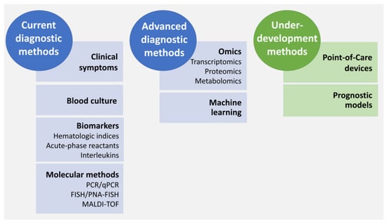 Despite the fair advances made in medicine over the years, LOS is still challenging to quickly and accurately diagnose, leading to delays in the application of an adequate treatment, which in turn may result in a higher risk of complications and, ultimately, a higher mortality rate [191]. This difficulty is attributed to several factors such as (i) variable or non-specific symptoms displayed by neonates [21,192], (ii) the maternal intrapartum antibiotic therapy that can mask the presence of bacteria [193] and (iii) the technical limitations of the diagnosis methods currently used [26,194]. Currently, the gold standard for the diagnosis of LOS is the identification of the causative agent through culture methods, namely from blood samples [195,196]. However, this method has time limitations resulting in a delayed diagnosis. As such, to try to speed up the diagnosis, other indicative analyses such as the use of molecular methods to help identify the causative agents, quantification of inflammatory molecules and the evaluation of clinical symptoms are often combined. Nevertheless, a timely and unambiguous diagnosis of LOS is still not available and, thus, there are still attempts to find new diagnostic strategies [12]. Figure 3 briefly summarizes the current, advanced and under-development diagnostic methods for the diagnosis of LOS.