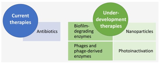 So far, the only available treatment option for NS, including LOS, is the use of antibiotics. As referred to above, due to the lack of methods that can accurately and quickly diagnose LOS, in the case of suspicion of LOS, clinicians initiate empirical broad-spectrum antibiotic treatments [21]. Indeed, several studies covering different countries have reported that most of the treatments for NS do not have a confirmed diagnosis. This can increase antibiotic resistance and, even though it may save lives, it may also result in important sequels for newborns such as reduced gut microbial diversity [264], invasive fungal infections, necrotising enterocolitis [265], inflammatory diseases [266] and increased likelihood of early childhood obesity [267]. Hence, several other therapeutic options, mainly antibiotic-independent, but also including the improvement of the activity and delivery of current antibiotics, with fewer side effects, are being explored. Herein, some of the strategies that are being investigated in the context of CoNS biofilms are outlined (Figure 4), but a more exhaustive list of strategies can be seen in [158,268,269,270]. Of note, due to biofilm characteristic heterogeneity (cells with different metabolic states and under different pH and levels of oxygen and nutrients), the use of combined strategies may increase our likelihood of effectively targeting biofilm infections. As such, there are some developments in the area already, with the combination of antibiotics with other new methods being one of the most common strategies [271,272,273,274,275].